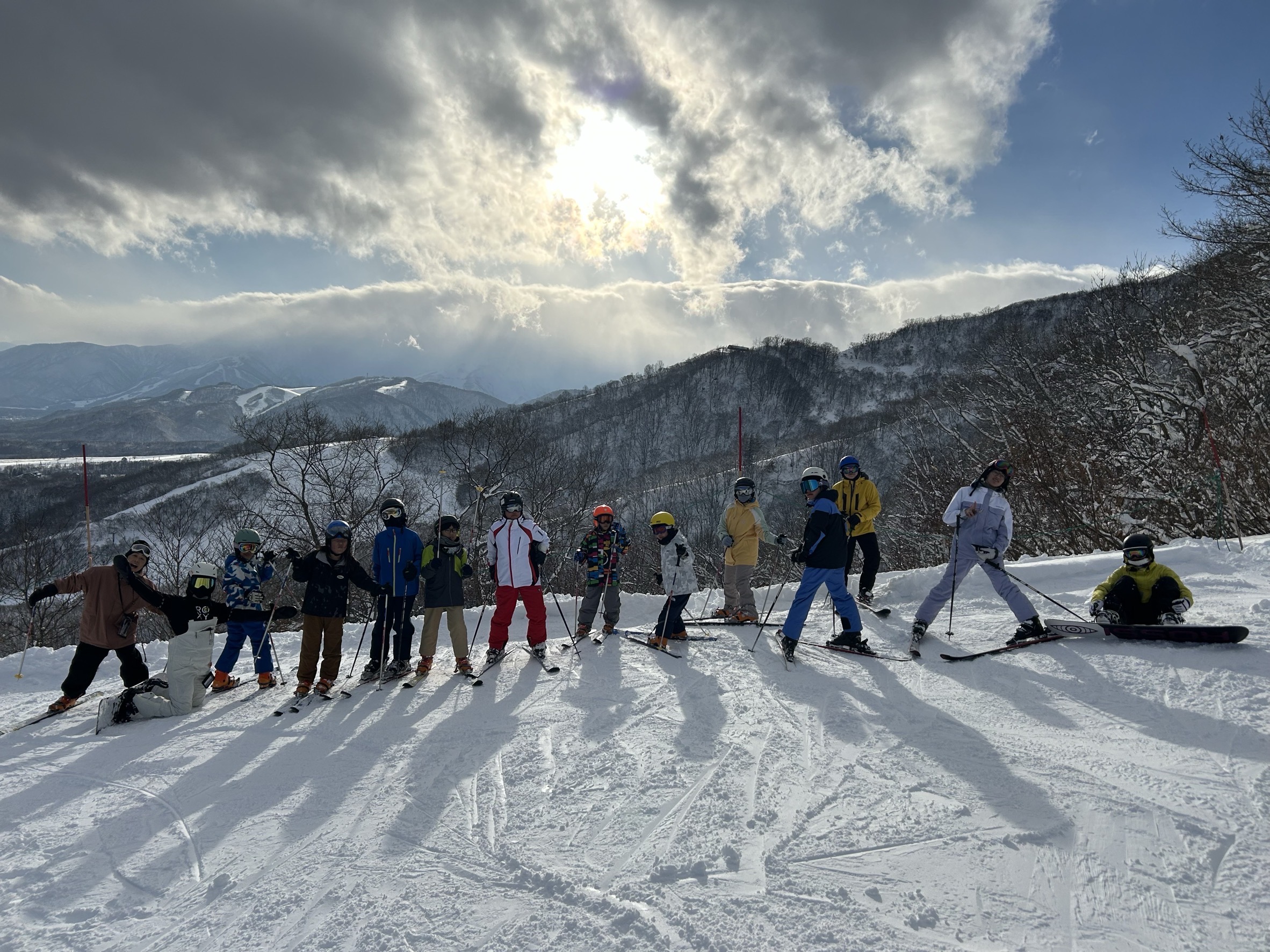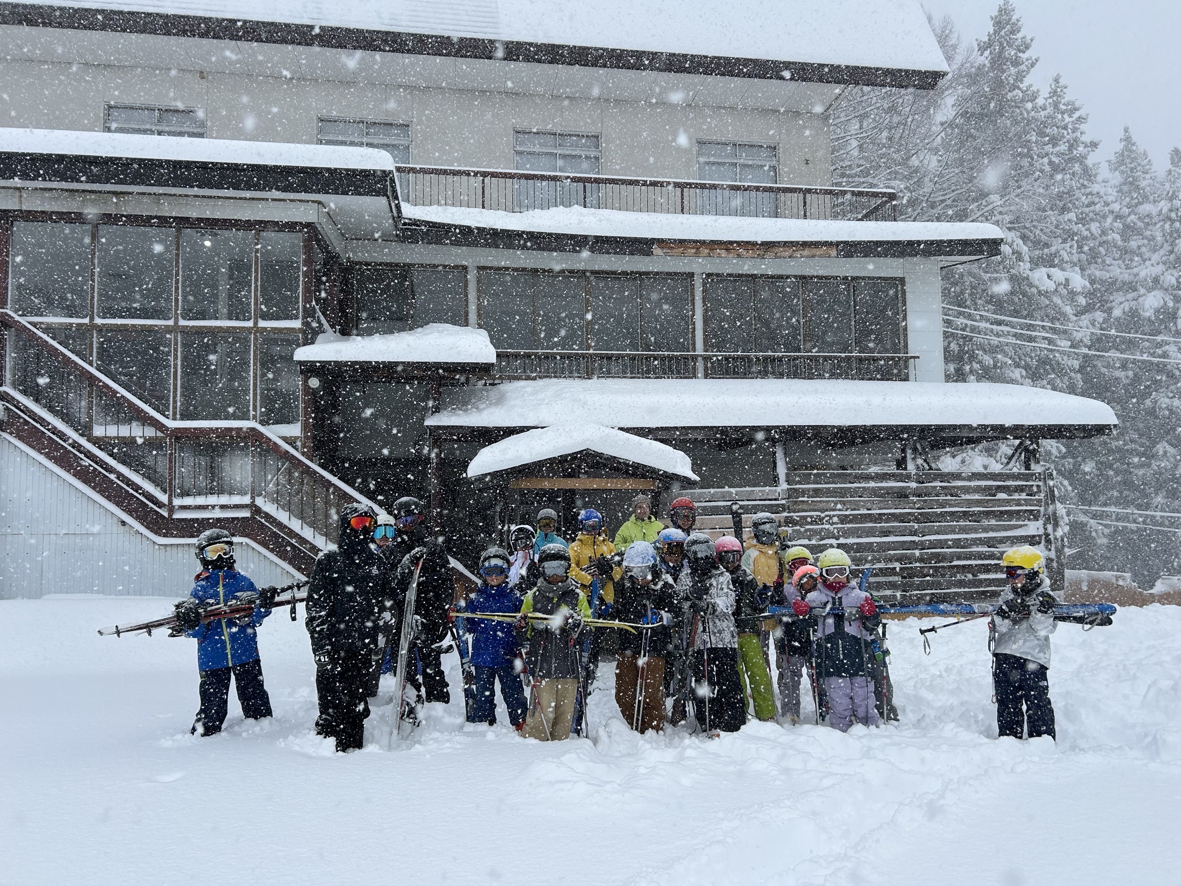 <12月25日〜28日、白馬乗鞍温泉スキー場> 参加小学生12名、中学生8名、高校生2名、保護者2名。初日は雨でリフトも運休でしたが、翌日から一気に雪が積もり、快晴の中で検定や新コースの冒険などを楽しみました。