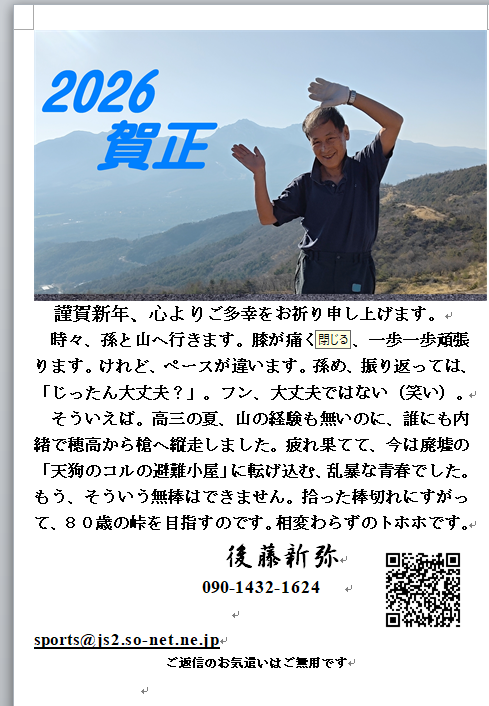 今年で80歳。<さあ、新たな人生だ>などという意気込みなどは全くありませ。が、。NPOバディ冒険団スポーツ研究室や江戸川大学、日本レジャーレクリエーション学会などを通して「面白いこと」を続けきました。昔、「スポーツUSA]という、スポーツをおちょくった番組を古館伊智郎氏とやったことがありますが、イタズラ心は相変わらずです。サイクルスポーツの科学基地「アマンダスポーツ」のHPを担当しています。アキレス腱周囲の故障や膝の靱帯損傷で「年だから治らない」と医者に宣告されていますが、歩くのは苦手でも、100Mはなんとか折り合いを付けて(笑い)。体は年相応、でも心は中学生レベル。早く大人になりたいなあ。