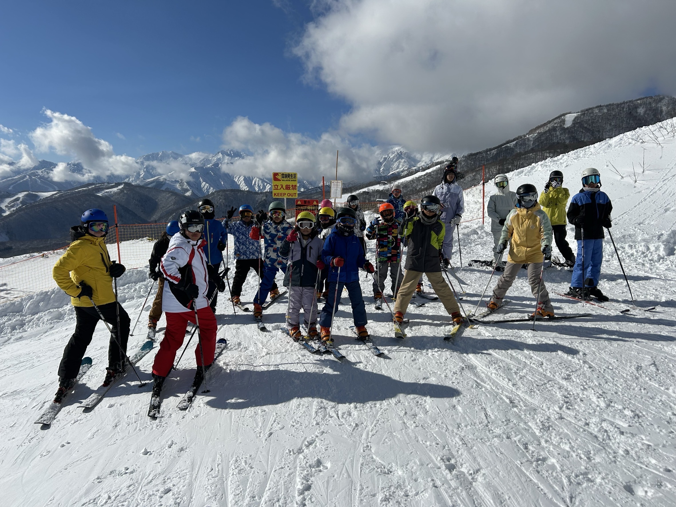 <12月25日〜28日、白馬乗鞍温泉スキー場> 参加小学生12名、中学生8名、高校生2名、保護者2名。初日は雨でリフトも運休でしたが、翌日から一気に雪が積もり、快晴の中で検定や新コースの冒険などを楽しみました。